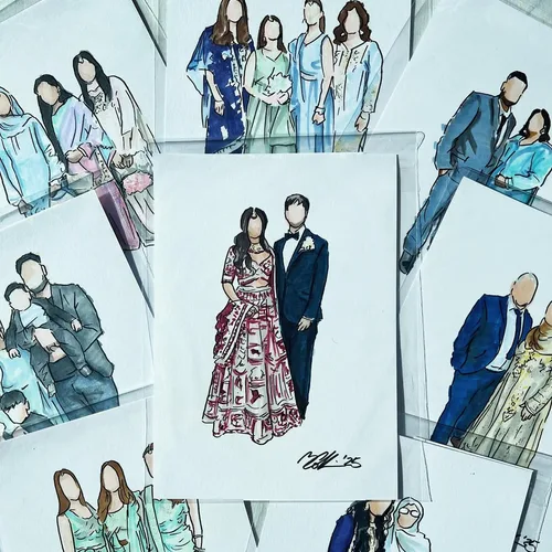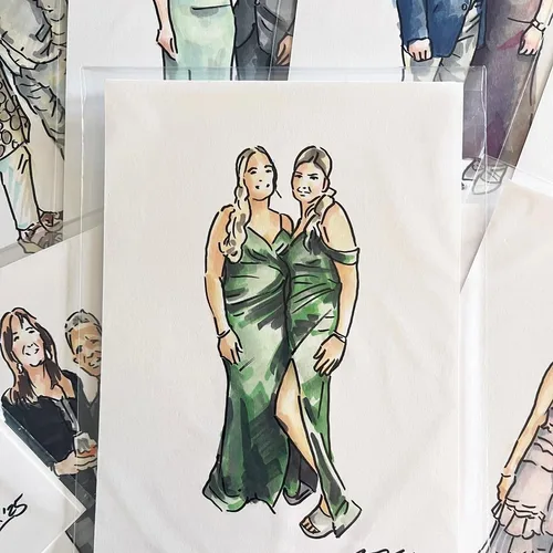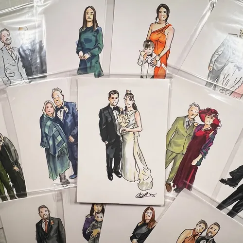 A wedding illustrator works live at your reception — moving through the room, producing illustrated portraits of your guests as the evening unfolds. Each portrait takes a few minutes. Guests sit for them, watch the image take shape, and leave with something personal and completely original. It creates a natural gathering point in the room and gives your reception a social energy that no playlist or photo booth comes close to matching.