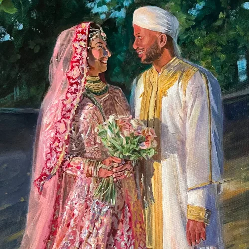 A photograph freezes a moment. A painting interprets it. The brushstrokes, the colour, the composition — it reflects how the day actually felt, not just how it looked. It's the difference between a record of your wedding and a piece of art that lives on your wall for the rest of your life.