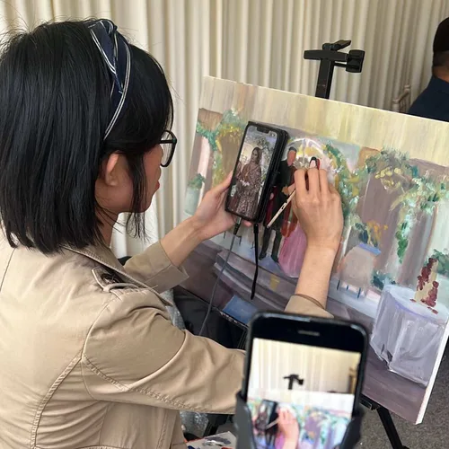 Decide what you'd like captured — the ceremony, the first dance, a wide reception scene. Your artist will advise on what works best for your venue and lighting. Most couples choose the reception so guests can watch the painting develop throughout the evening.