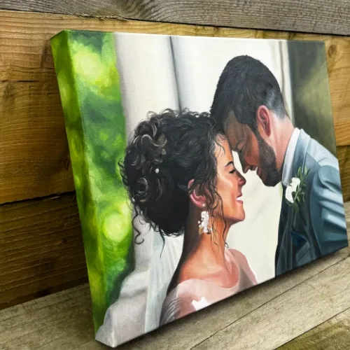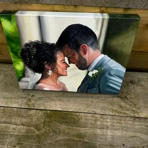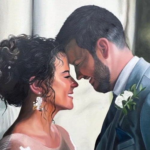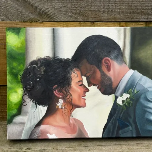 A ‘wedding portrait commission’ or ‘wedding portrait painting’ is a custom, often painted or drawn, portrait of a couple some time after their wedding day from a picture. The commission captures the your likeness, attire, and sometimes other personalized elements in a unique, handcrafted way such as adding in family members who couldn’t be there on the day. These portraits can range from realistic and detailed representations to more stylized or abstract forms, depending on the artist’s specialty and your preferences.